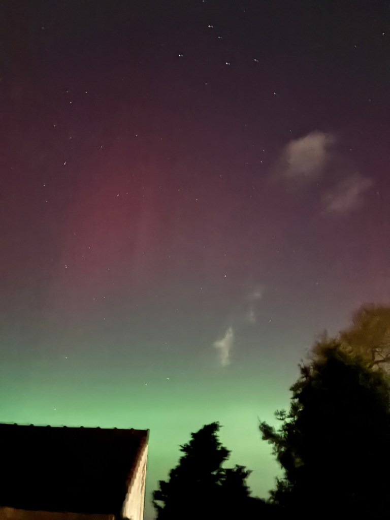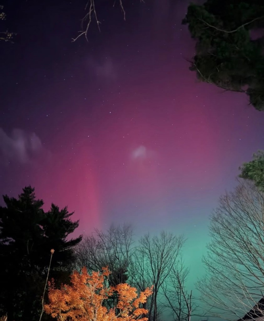 Witnessing the Northern Lights, also known as the Aurora Borealis, has always been a top item on my bucket list. While a typical occurrence for strong sightings might be rare especially in New Hampshire, I’ve been lucky enough to see this incredible display twice in just over a year. This is thanks to us being right in the middle of the sun’s peak 11-year solar cycle. The Aurora Borealis follows a geomagnetic scale, which varies from G1 (minor) to G5 (extreme). Both sightings—last year and just the other day—were categorized as a G4 (severe).